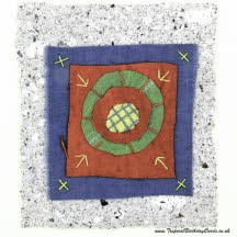 This greeting card design is made with several types of silk and cotton with plant dyes: madder roots give the red; the yellow is from weld leaves and the blue from woad leaves. The green is made from weld over-dyed with woad. The embroidery threads are also made from silk dyed with plant dyes. The speckled brown backing paper is made from a mixture of banana skin and recycled paper.