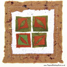 This greeting card design features a silk that is first dyed with weld and then either over dyed with woad for green, or with madder for the orange. Onion-skin handmade paper in the background.